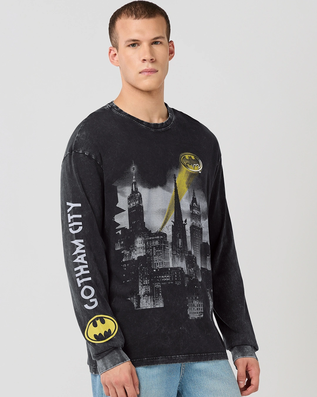Men’s Black Gotham City Graphic Printed Oversized Acid Wash T-shirt